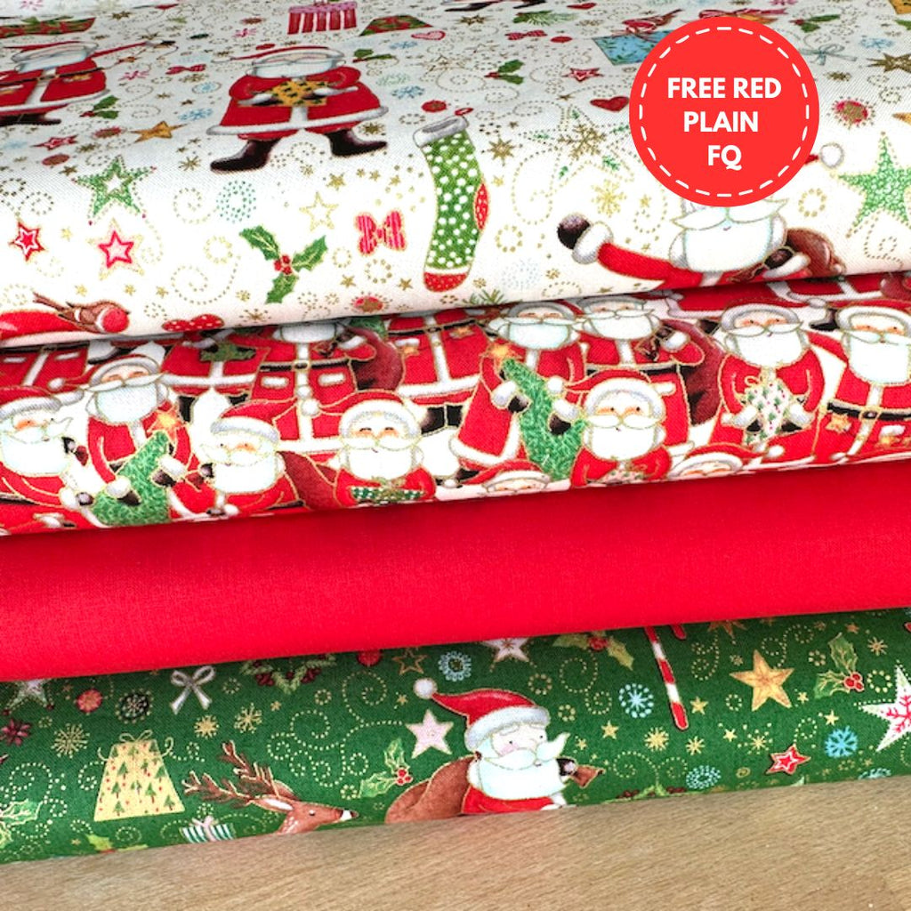 Santa's Delight 4 Piece Fat quarter Bundle 100% Cotton Fabrics & FREE RED FQ
