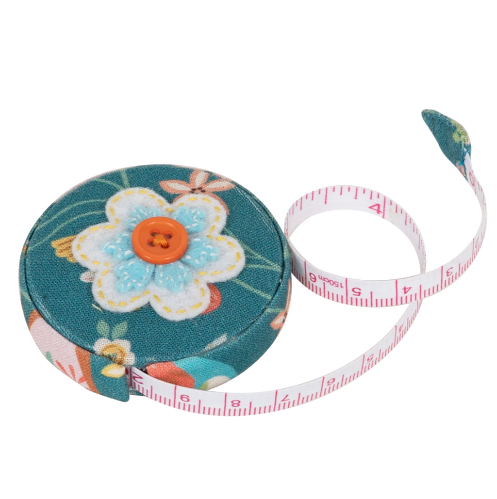 Retractable tape measure, covered in cotton fabric with an appliqué detail. 150cm/60 inch long tape with imperial and metric measurements. Spot clean only. Item size: (d/w/h) 5 x 5 x 1cm.